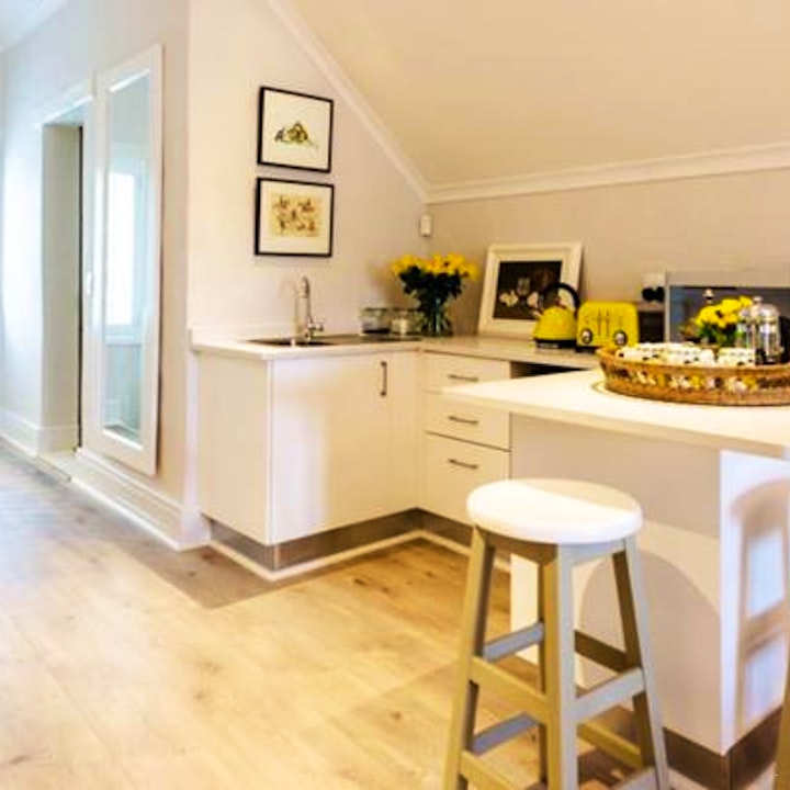 The Luxury Modern Loft Suite is suited to accommodate 3 guests and comes equipped with a king-size and a sleeper couch available for a child. In-room facilities include a kitchenette, en-suite shower, and a balcony. Access is through the rose gardens and up a spiral staircase, not suitable for elderly or frail guests.